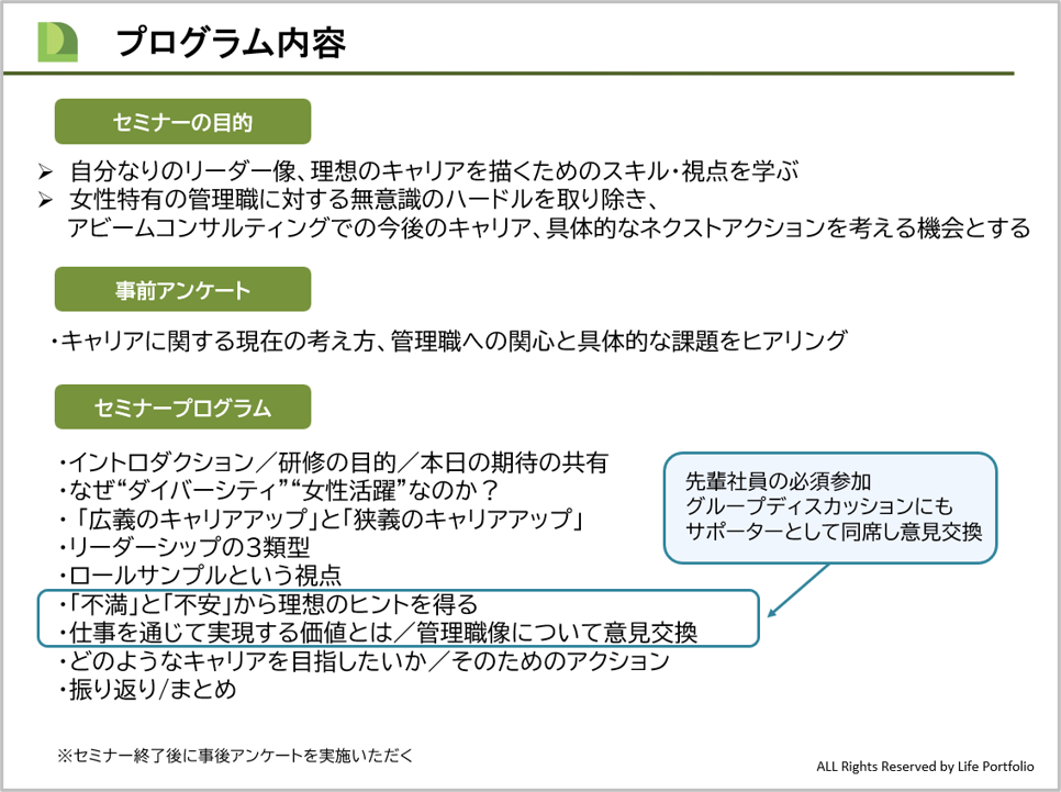 | 内容 | 女性の管理職候補向けキャリアデザイン研修 |